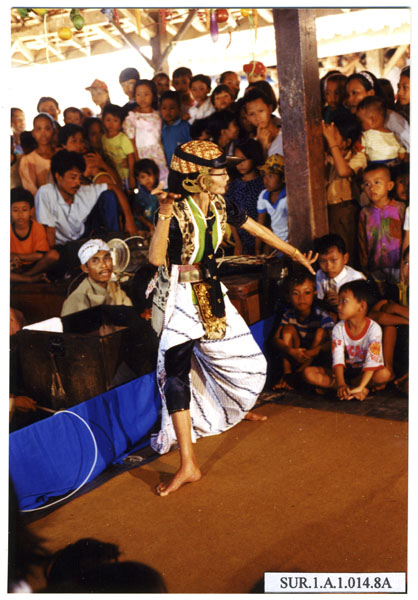 Rasinah menari topeng Tumenggung dalam Pertunjukan Tari Topeng Gunung Jati di Cirebon, Jawa Barat.