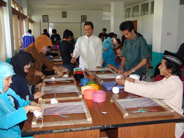 Para peserta praktik menenun menggunakan media sederhana dalam Pelatihan Guru PSN topik "Tekstil" pada 4-8 Agustus 2005 di Bandung.