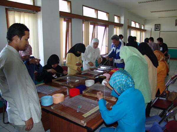 Para peserta praktik menenun menggunakan media sederhana dalam Pelatihan Guru PSN topik "Tekstil" pada 4-8 Agustus 2005 di Bandung.