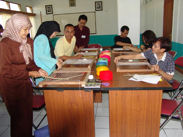 Para peserta praktik menenun menggunakan media sederhana dalam Pelatihan Guru PSN topik "Tekstil" pada 4-8 Agustus 2005 di Bandung.