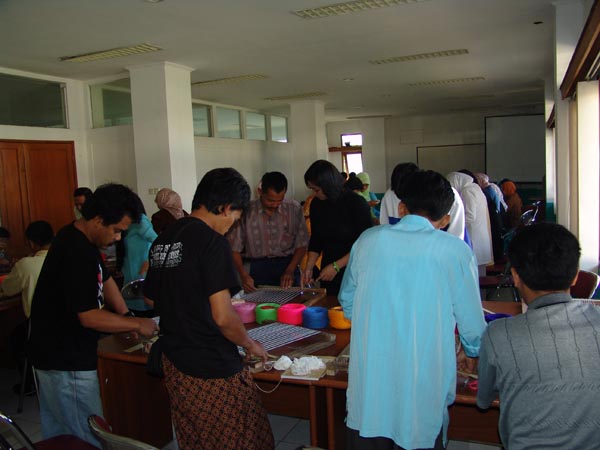 Para peserta praktik menenun menggunakan media sederhana dalam Pelatihan Guru PSN topik "Tekstil" pada 4-8 Agustus 2005 di Bandung.