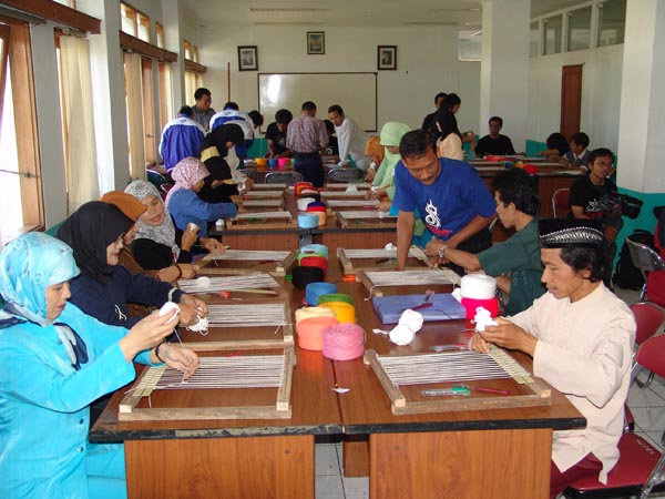 Para peserta praktik menenun menggunakan media sederhana dalam Pelatihan Guru PSN topik "Tekstil" pada 4-8 Agustus 2005 di Bandung.