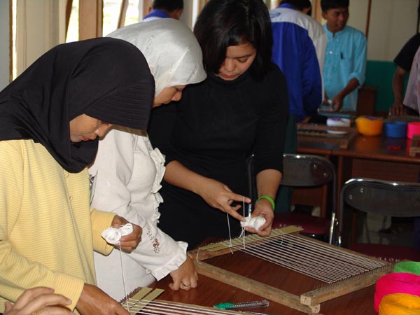 Para peserta praktik menenun menggunakan media sederhana dalam Pelatihan Guru PSN topik "Tekstil" pada 4-8 Agustus 2005 di Bandung.