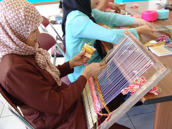 Para peserta praktik menenun menggunakan media sederhana dalam Pelatihan Guru PSN topik "Tekstil" pada 4-8 Agustus 2005 di Bandung.