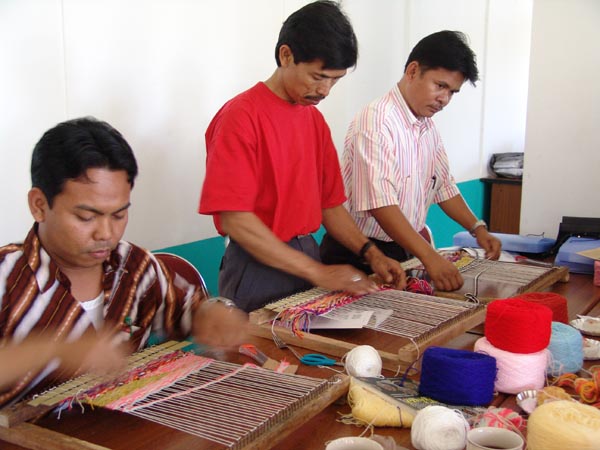 Para peserta praktik menenun menggunakan media sederhana dalam Pelatihan Guru PSN topik "Tekstil" pada 4-8 Agustus 2005 di Bandung.