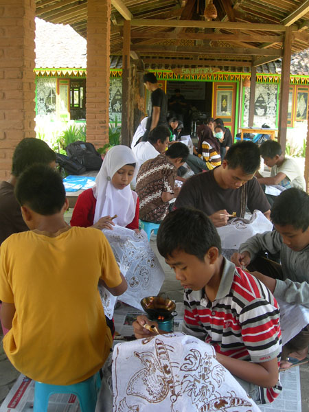 Para peserta praktik mencanting dalam Workshop Batik yang digelar dalam Jambore Pendidikan Seni Nusantara 2012 pada 23-30 April 2012 di Bororbudur, Magelang, Jawa Tengah. Mencanting adalah salah satu tahap membatik yakni mencelupkan canting ke dalam wajan yang berisi malam yang meleleh, kemudian menggoreskannya mengikuti pola yang telah digambar pada kain.