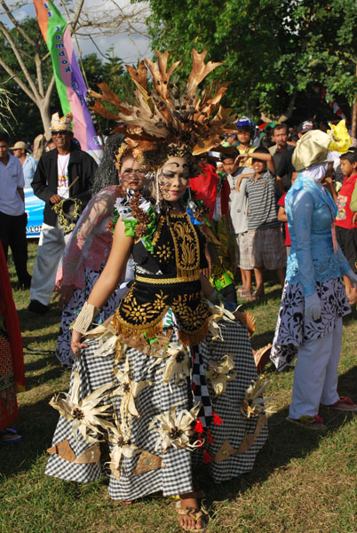 Seorang peserta asal Banyuwangi memakai busana bermotif kuning emas dan penutup kepala dari potongan daun pada Pawai Budaya dalam acara Bulan Citra Budaya di Lombok Tengah - 17 Juli 2009.