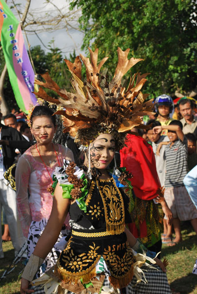 Seorang peserta asal Banyuwangi memakai busana bermotif kuning emas dan penutup kepala dari potongan daun pada Pawai Budaya dalam acara Bulan Citra Budaya di Lombok Tengah - 17 Juli 2009.