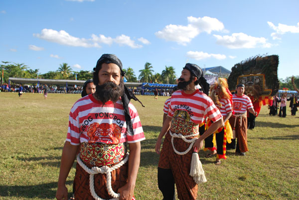 Sejumlah peserta BCB memakai kostum warok pada Pawai Budaya dalam acara Bulan Citra Budaya di Lombok Tengah - 17 Juli 2009. Tampak di belakang reog sedang dimainkan oleh seorang peserta.