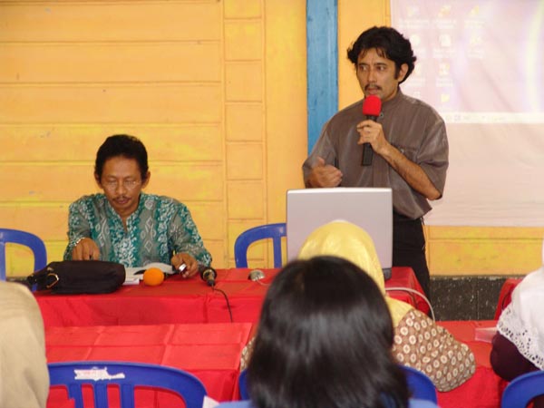 Zaini Rais (pelatih, Dosen FSRD ITB) menyampaikan materi topik "Tekstil" kepada para peserta dalam Pelatihan Guru PSN pada 3-7 Juli 2005 di Banyuwangi. Tampak Subandi (kiri), pelatih lainnya.