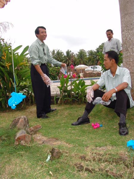 Peserta menjemur kain ikat yang telah diwarnai sebagai proses terakhir dari praktik rekalatar teknik celup ikat. Praktik ini berlangsung dalam Pelatihan Guru PSN topik "Tekstil" pada 3-7 Januari 2005 di Banyuwangi.