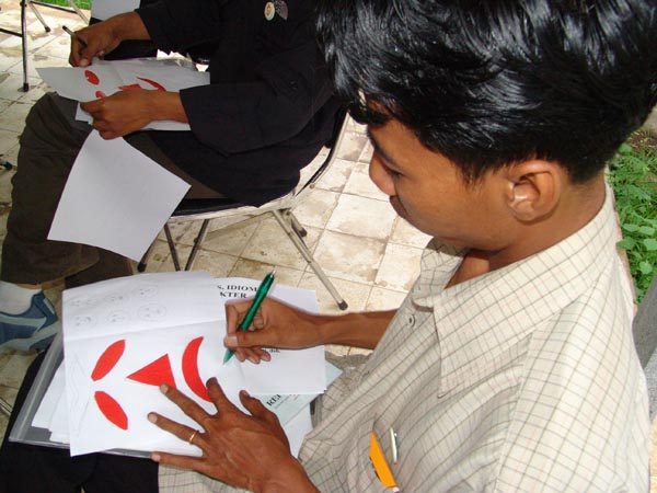 Seorang peserta membuat desain topeng berupa ekspresi (wajah) sedih dalam Pelatihan Guru PSN topik "Topeng" pada 14-18 Januari 2006 di Banyuwangi.