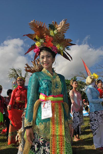 Seorang peserta memakai busana kebaya dengan penutup kepala dari daun dan bunga pada Pawai Budaya dalam acara Bulan Citra Budaya di Lombok Tengah - 17 Juli 2009.