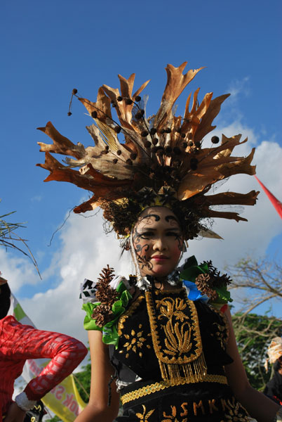 Seorang peserta memakai busana bermotif kuning emas dan penutup kepala dari potongan daun pada Pawai Budaya dalam acara Bulan Citra Budaya di Lombok Tengah - 17 Juli 2009.