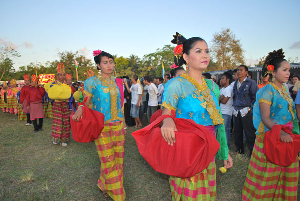 Barisan peserta perempuan memakai pakaian yang seragam dan membawa bungkusan merah pada Pawai Budaya BCB NTB 2009 tanggal 17 Juli 2009 di Praya - Lombok Tengah.