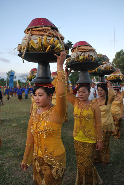 Para peserta pawai membawa jajanan dan buah-buahan di atas kepala pada Pawai Budaya BCB NTB 2009 tanggal 17 Juli 2009 di Praya - Lombok Tengah.
