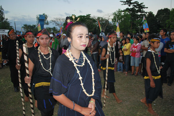 Kelompok peserta memakai pakaian hitam-hitam dan membawa tongkat pada Pawai Budaya BCB NTB 2009 di Praya Lombok Tengah.