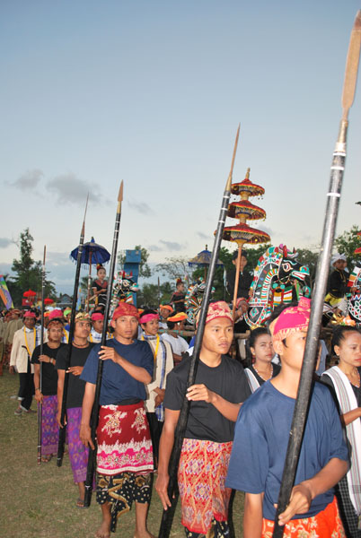 Kelompok peserta berjalan berbaris membawa tombak pada Pawai Budaya BCB NTB 2009 tanggal 17 Juli 2009 di Praya - Lombok Tengah.