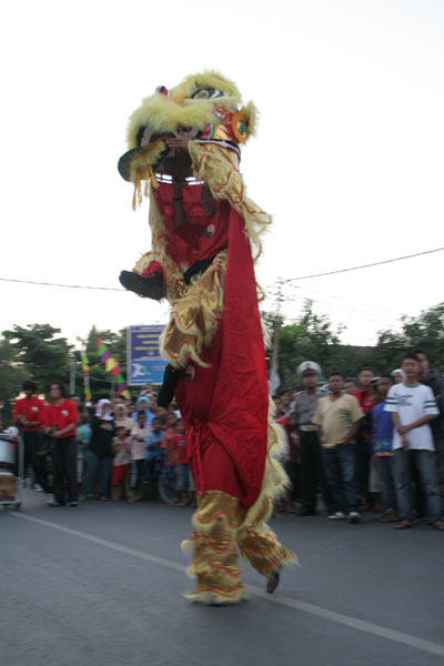 Sebuah barongsai berwarna kuning dan merah tampak menari pada Pawai Budaya BCB NTB 2009 tanggal 17 Juli 2009 di Praya - Lombok Tengah.