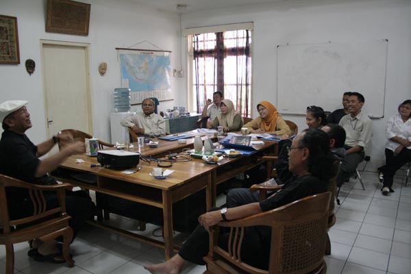 Putu Wijaya (kiri, instruktur) menyampaikan materi kepada para peserta yang terdiri atas guru-guru SMA jaringan LPSN di Jakarta dalam Pelatihan PSN topik "Teater" pada Agustus 2007 di kantor LPSN, Jakarta.