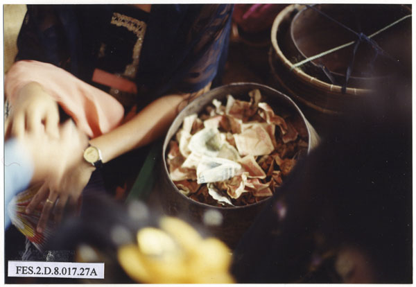 Uang saweran yang ditempatkan dalam Bonang dari para penonton dan partisipan upacara Ngarot di Desa Lelea Kabupaten Indramayu Jawa Barat
