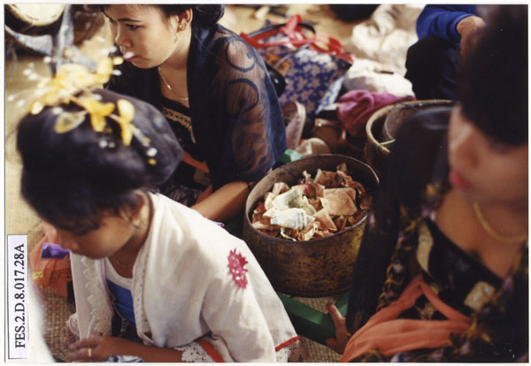 Uang saweran yang ditempatkan dalam Bonang dari para penonton upacara Ngarot di Desa Lelea Kabupaten Indramayu Jawa Barat