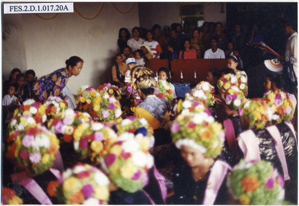 Kasinoman Wadon mengenakan kostum dengan hiasan bunga di kepalanya dalam upacara Ngarot di Desa Lelea Kabupaten Indramayu Jawa Barat