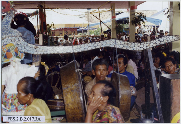 Nayaga memukul gong mengiringi ketuk tilu dengan ancak gong berbentuk naga dalam upacara Ngarot di desa Lelea Kabupaten Indramayu Jawa Barat