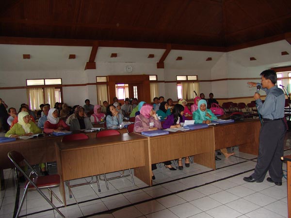 Instruktur pelatihan menyampaikan materi dalam Pelatihan Guru PSN topik "Alat Musik Dawai" pada Agustus 2005 di Wisma Bumi Kitri, Bandung, Jawa Barat.