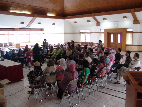Para peserta menyimak materi yang disampaikan Endo Suanda (instruktur) dalam Pelatihan Guru PSN topik "Alat Musik Dawai" pada Agustus 2005 di Wisma Bumi Kitri, Bandung, Jawa Barat.