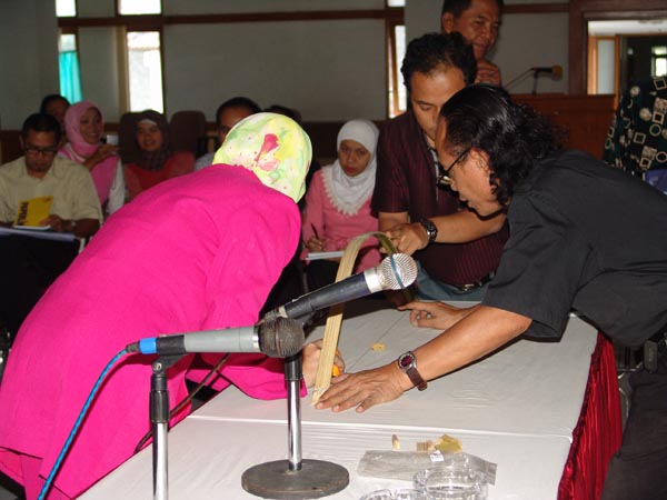 Endo Suanda menerangkan konsep sumber bunyi dengan media seutas kawat kopling bekas dalam Pelatihan PSN topik "Alat Musik Dawai" pada Agustus 2005 di Wisma Bumi Kitri, Bandung, Jawa Barat.