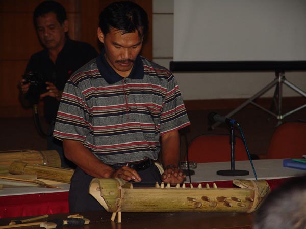 Heri Herdini (instruktur pelatihan) memainkan kecapi bambu karya peserta Pelatihan PSN topik "Alat Musik Dawai" pada Agustus 2005 di Bandung, Jawa Barat.