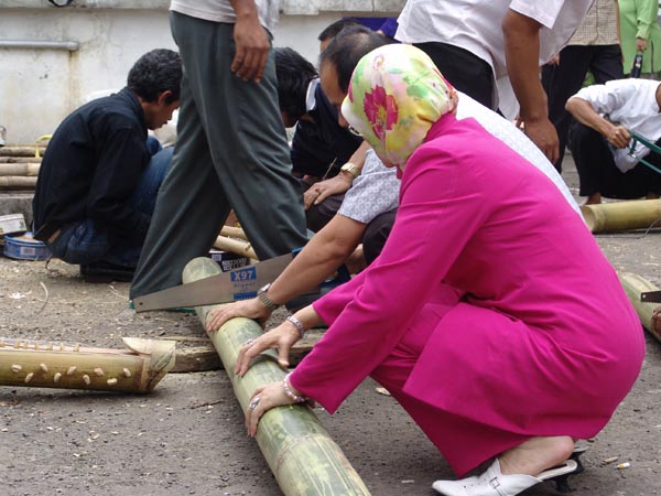 Peserta memotong bambu sebagai bahan membuat alat musik pada Pelatihan PSN topik "Alat Musik Dawai" pada Agustus 2005 di Bandung, Jawa Barat.