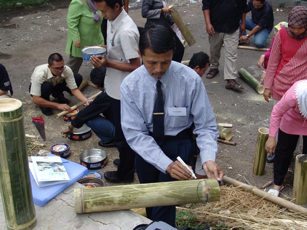 Peserta menggambar desain gambar celempung pada sebuah bambu dalam Pelatihan PSN topik "Alat Musik Bambu" pada Agustus 2005 di Bandung, Jawa Barat.