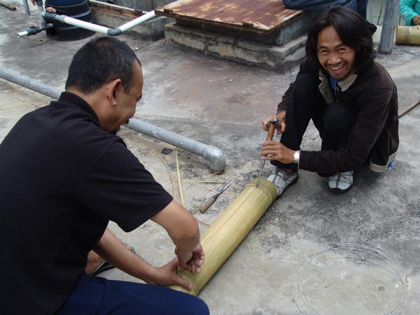 Peserta mengupas permukaan bambu untuk membuat celempung dalam Pelatihan PSN topik "Alat Musik Bambu" pada Agustus 2005 di Bandung, Jawa Barat.
