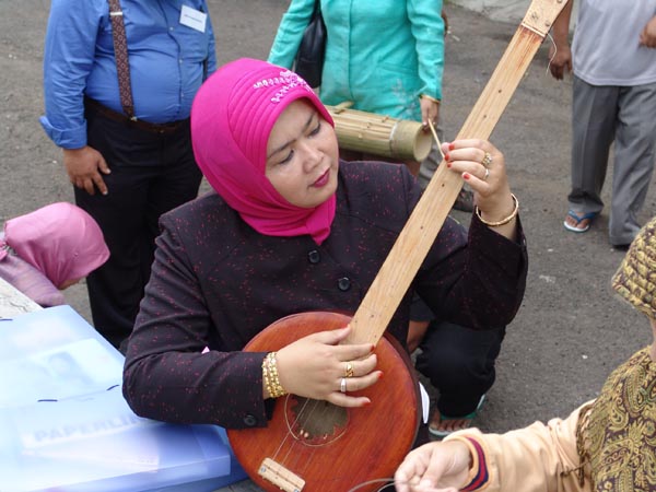 Seorang guru dari Jawa Barat memainkan alat musik dawai berbentuk gambus karya siswa asal Padang, Sumatera Barat dalam Pelatihan PSN topik "Alat Musik Dawai" pada Agustus 2005 di Bandung.
