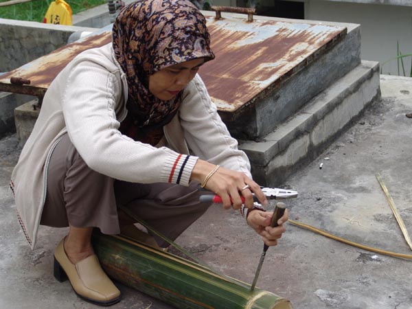 Tak hanya untuk laki-laki, peserta perempuan ini juga aktif menjadi peserta Pelatihan PSN topik "Alat Musik Dawai" pada Agustus 2005 di Bandung. Tampak peserta ini sedang mengupas ruas batang bambu untuk dibuat celempung. Celempung adalah alat musik tradisional dari Jawa Barat yang terbuat dari bambu yang sumber bunyinya berasal dari ruas batang bambu yang beresonansi saat dipukul.