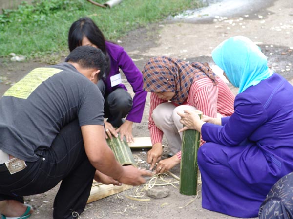 Para peserta sedang mengupas ruas batang bambu untuk dibuat celempung dalam Pelatihan PSN topik "Alat Musik Dawai" pada Agustus 2005 di Bandung. Celempung adalah alat musik tradisional dari Jawa Barat yang terbuat dari bambu yang sumber bunyinya berasal dari ruas batang bambu yang beresonansi saat dipukul.