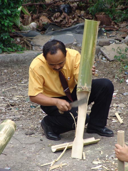 Peserta membuat gambus dari bambu dalam Pelatihan PSN topik "Alat Musik Dawai" pada Agustus 2005 di Bandung.
