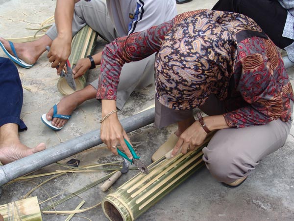 Peserta membuat celempung dalam Pelatihan PSN topik "Alat Musik dawai" pada Agustus 2005 di Bandung, Jawa Barat. Celempung adalah alat musik tradisional dari Jawa Barat yang terbuat dari bambu yang sumber bunyinya berasal dari ruas batang bambu yang beresonansi saat dipukul.