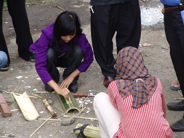 Peserta membuat celempung dalam Pelatihan PSN topik "Alat Musik dawai" pada Agustus 2005 di Bandung, Jawa Barat. Celempung adalah alat musik tradisional dari Jawa Barat yang terbuat dari bambu yang sumber bunyinya berasal dari ruas batang bambu yang beresonansi saat dipukul.