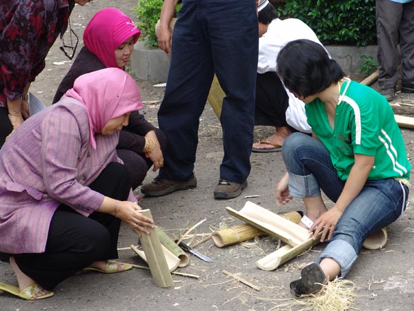 Para peserta praktik secara berkelompok membuat alat musik dawai dari bambu dalam Pelatihan PSN pada Agustus 2005 di Bandung, Jawa Barat.