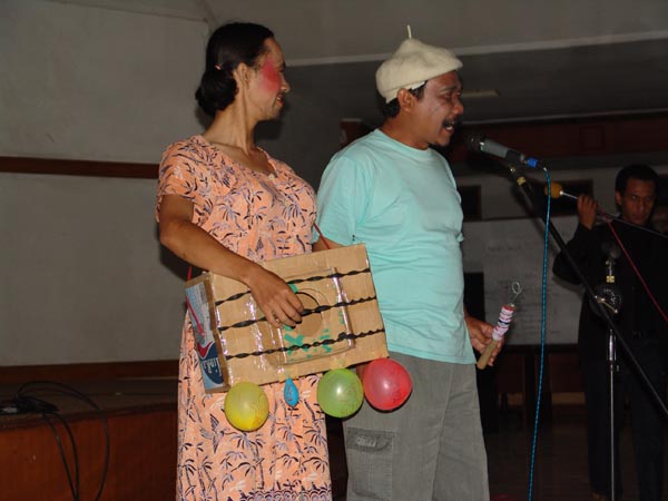Cupit Danuwarta (kiri, Guru SMA Santiyama, Tasikmalaya) dan Agus A.W. (kanan, Guru MAN Cipasung, Tasikmalaya) memainkan sandiwara longser pada Penutupan Pelatihan PSN topik "Alat Musik Dawai" dan "Tekstil" pada 8 Agustus 2005 di Wisma Bumi Kitri, Bandung. Longser adalah teater tradisional masyarakat Sunda yang bermuatan humor dan kritik sosial.