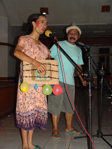 Cupit Danuwarta (kiri, Guru SMA Santiyama, Tasikmalaya) dan Agus A.W. (kanan, Guru MAN Cipasung, Tasikmalaya) memainkan sandiwara longser pada Penutupan Pelatihan PSN topik "Alat Musik Dawai" dan "Tekstil" pada 8 Agustus 2005 di Wisma Bumi Kitri, Bandung. Longser adalah teater tradisional masyarakat Sunda yang bermuatan humor dan kritik sosial.