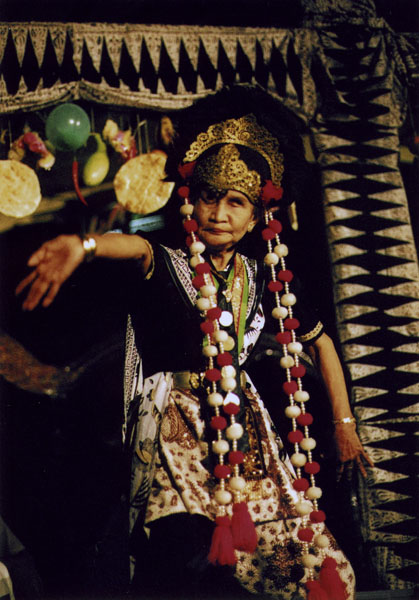 Tari Topeng Pamindo yang dipertunjukan oleh Mimi Rasinah dalam acara Temu Maestro Rasinah dan Jeihan di Cafe Toko You Bandung Jawa Barat ca. 2005