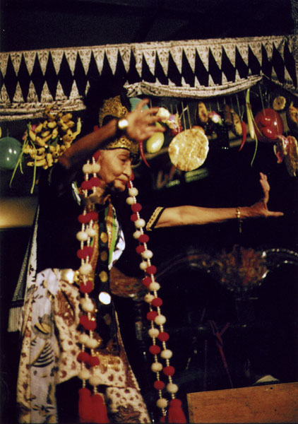 Tari Topeng Pamindo yang dipertunjukan oleh Mimi Rasinah dalam acara Temu Maestro Rasinah dan Jeihan di Cafe Toko You Bandung Jawa Barat ca. 2005