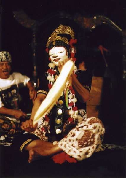 Tari Topeng Pamindo yang dipertunjukan oleh Mimi Rasinah dalam acara Temu Maestro Rasinah dan Jeihan di Cafe Toko You Bandung Jawa Barat ca. 2005