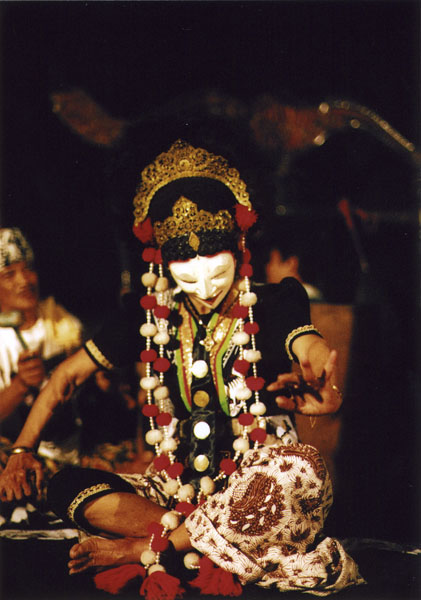 Tari Topeng Pamindo yang dipertunjukan oleh Mimi Rasinah dalam acara Temu Maestro Rasinah dan Jeihan di Cafe Toko You Bandung Jawa Barat ca. 2005