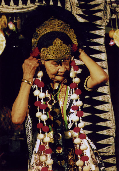 Tari Topeng yang dipertunjukan oleh Mimi Rasinah dalam acara Temu Maestro Rasinah dan Jeihan di Cafe Toko You Bandung Jawa Barat ca. 2005