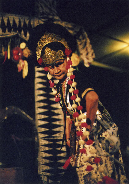 Tari Topeng yang dipertunjukan oleh Mimi Rasinah dalam acara Temu Maestro Rasinah dan Jeihan di Cafe Toko You Bandung Jawa Barat ca. 2005